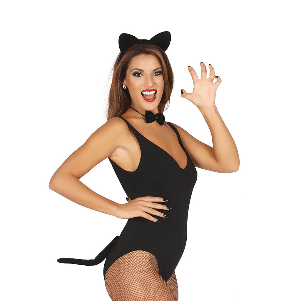 Conjunto de gatinha preta para adulto composto por bandolete com orelhas de gato,laço e rabo