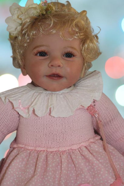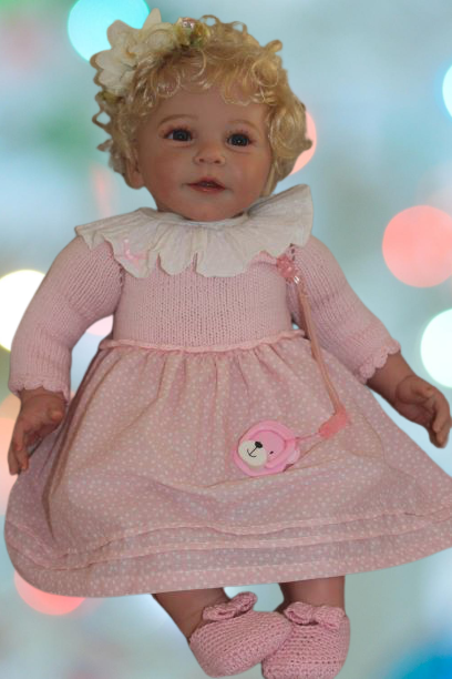 Boneca bébé de 50 cms, corpo macio, pernas e braços articulados,cabeço caracóis enraizado, olhos fixos, Pintura manual.