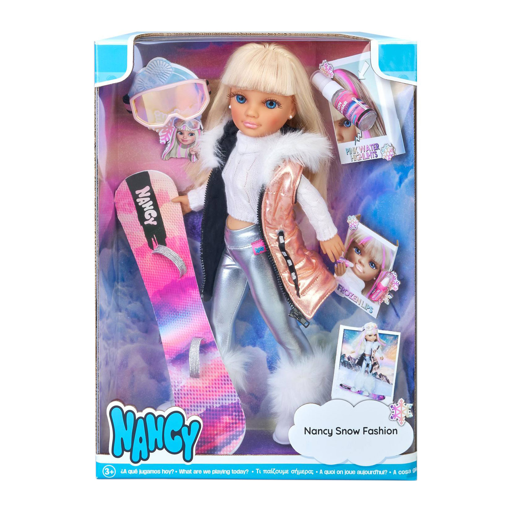 Usa uma prancha multicolorida personalizada com o seu nome, óculos de sol polarizados, um colete metálico com pêlo no capuz, para combinar com as botas e leggings prateadas que combinam perfeitamente com a sua gola branca. Para se proteger do sol, usa o batom incluído.