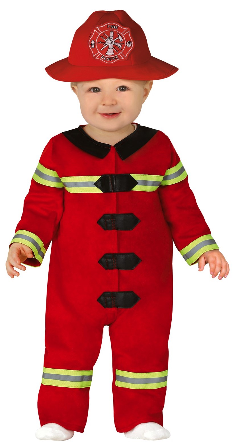 Disfarce Bombeiro bebé, composto por macaquinho com motivos amarelos e chapéu