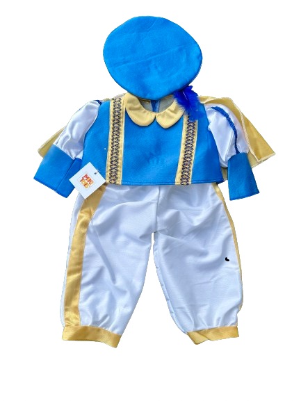 Fato de Princípe composto por camisa em tecido forrado, calças, capa e boina com pena.