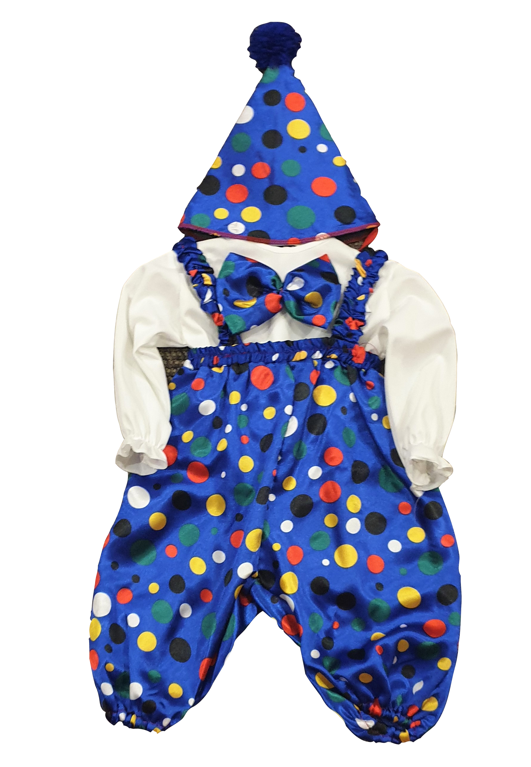 Fato de Palhaçinho composto por calças de balão, camisa com laço e chápeu com pompom.