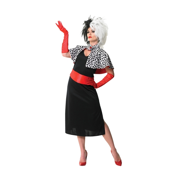 Disfarce da Cruella de Vil composto por Vestido, capa, luvas e peruca.