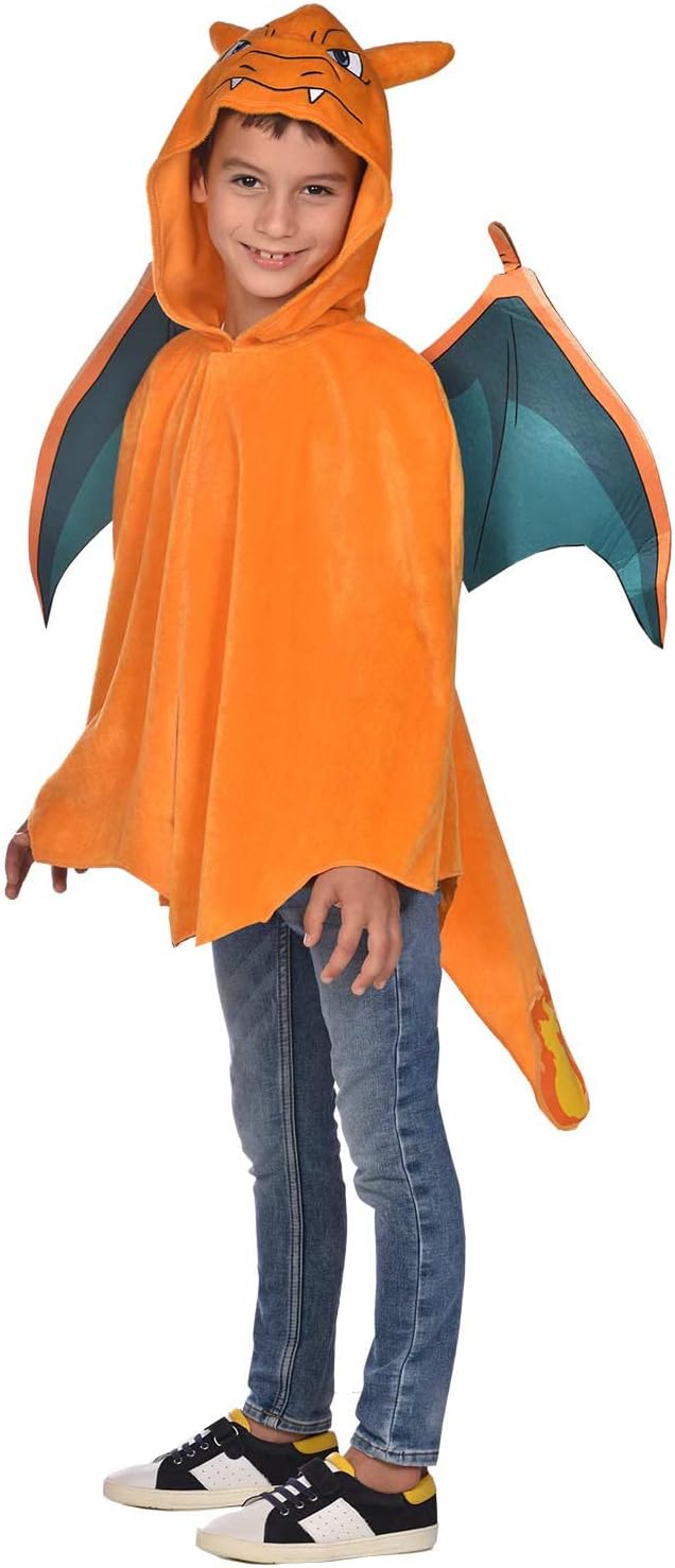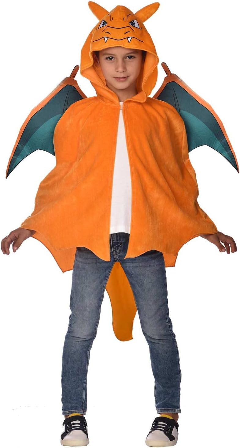 Disfarce de Charizard composto por capa com cauda e gorro com imagem da personagem