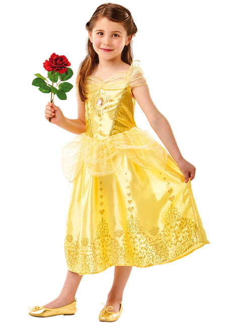 Disfarce da princesa Belle deluxe. Vestido com saia estampada a dourado.No peito a figura da princesa Belle.