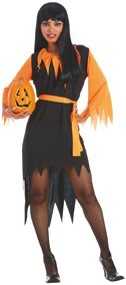 Disfarce de bruxa para adulto com gola laranja e cinto. A abóbora não está incluída. Tamanho (38-40)