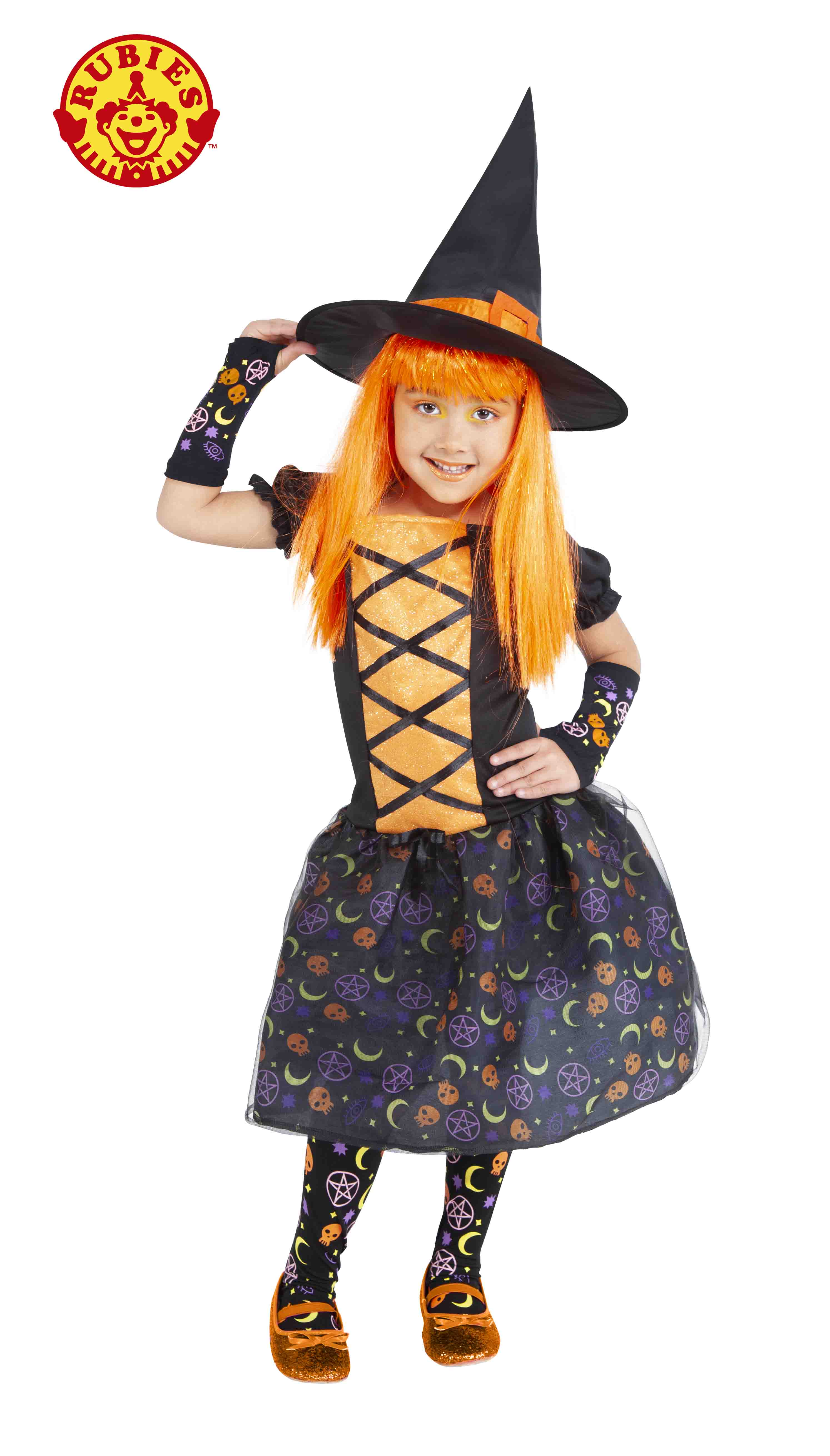 Disfarce de Bruxinha composto por vestido estampado, chapéu ,manguitos e meias.