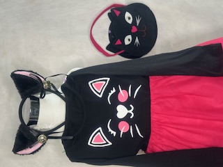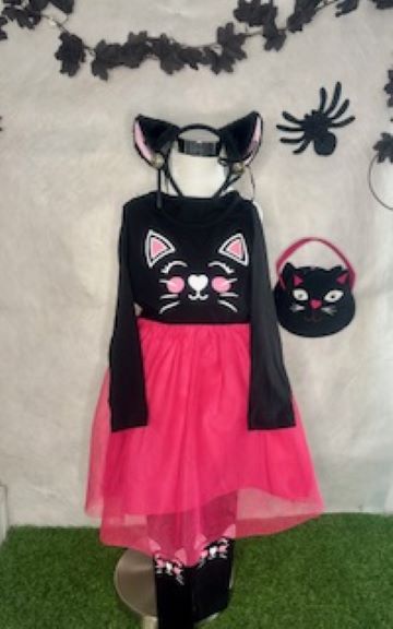Disfarce de Gatinho composto por vestido com corpo em malha estampado, saia em tule com saiote interior, leggings e bandolete.