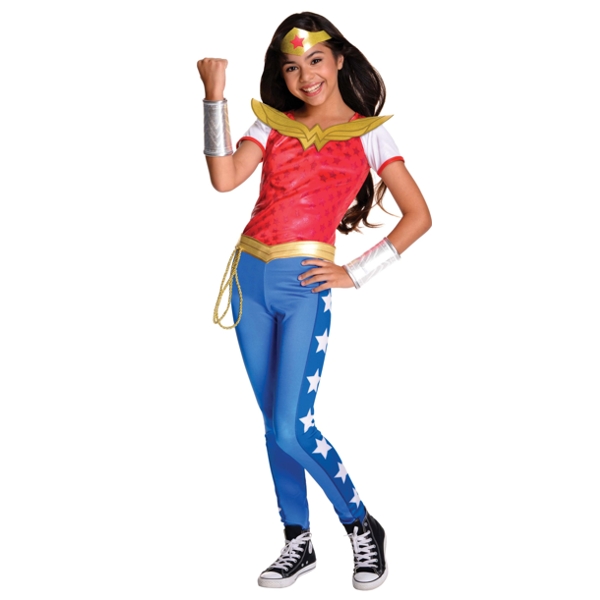 Wonder Woman Super Heroínas com top, calças, cinto com laço, punhos e tiara.